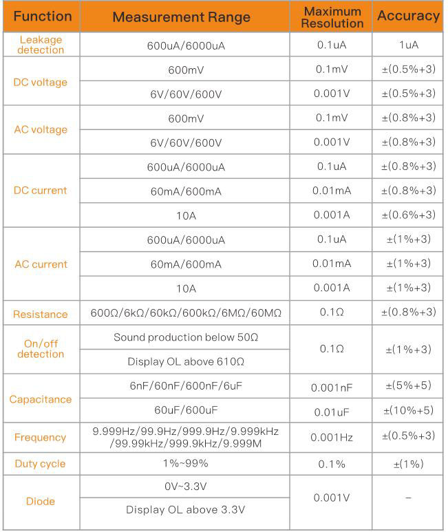 HD Large Screen High-definition large screen LCD backlight display, more intuitive operational interaction, and keep the clear display in low-light environments. Comprehensive Functionality Xhorse Digital Multimeter can be used to measure AC/DC voltage, AC/DC current, resistance, capacitance, frequency, duty cycle, diode and continuity. And it can also effectively achieve useful functions such as data holding, range switching, screen backlight switching, function switching, automatic shutdown, etc.Leakage Detection Featured fast detection function, providing a 3V DC power supply. It is accurate to 0.1μA and suitable for static leakage detection of electronic products, especially for remote leakage detection.